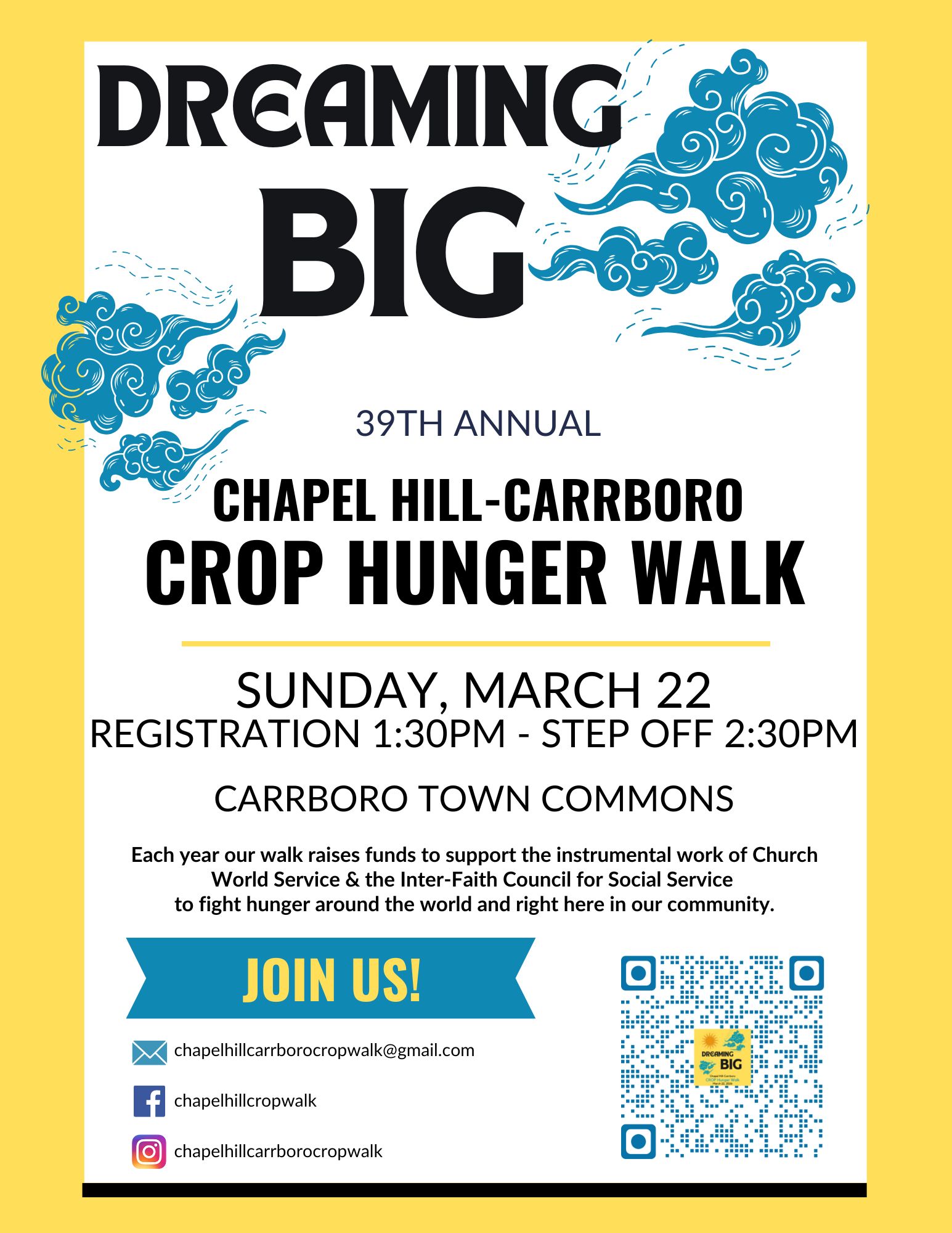 The 39th Annual Chapel Hill-Carrboro CROP Hunger Walk is scheduled for Sunday, March 22, 2026! Walk registration begins at 1:30pm. Step off time is 2:30pm.